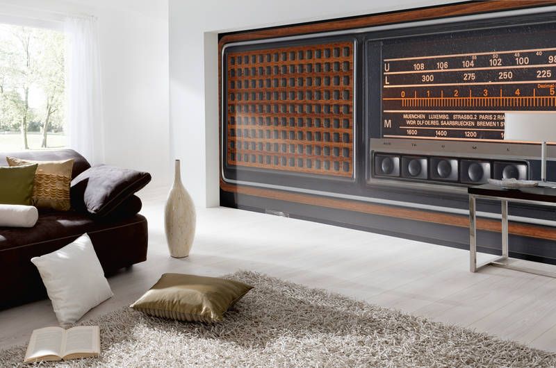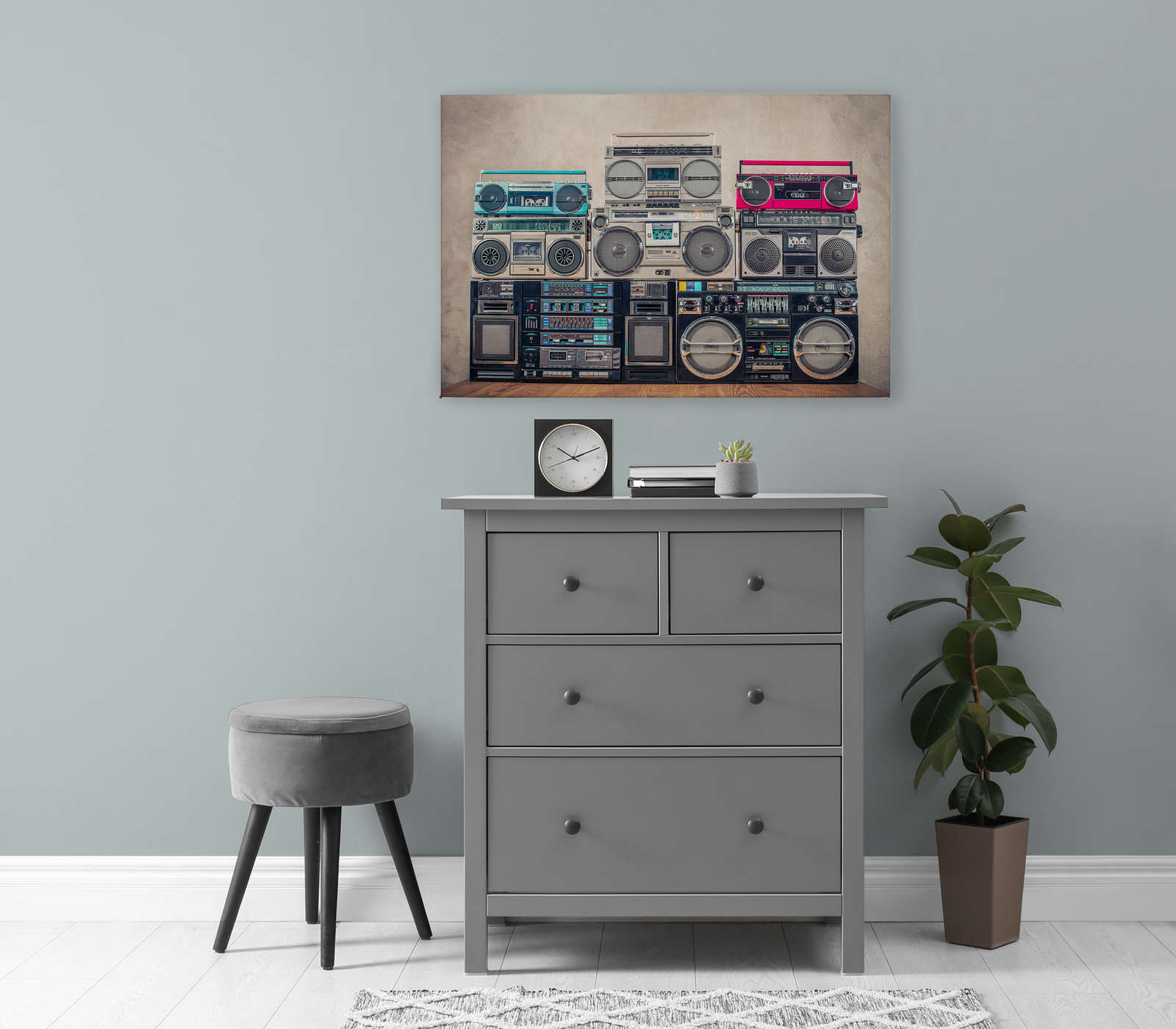 Canvas painting Radios on wooden table in front of wall - 0,90 m x 0,60 m