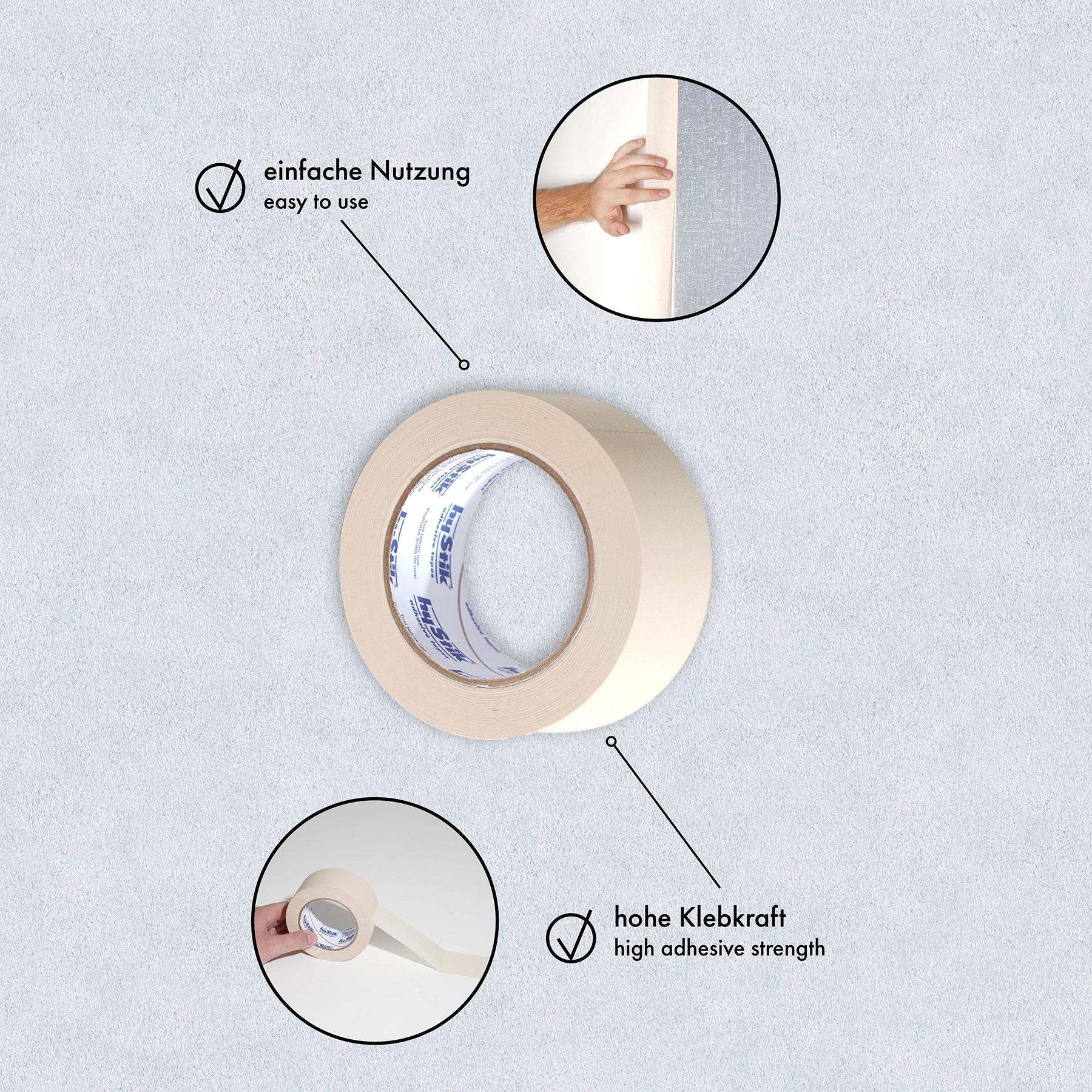 Painter's tape made of crepe paper with adhesive coating on one side. Dimensions: Run length 50m, width 50mm. Suitable for masking painting edges and fixing masking and splash protection. Ideal for all painting and wallpapering works. For clear edges and clean finishes.