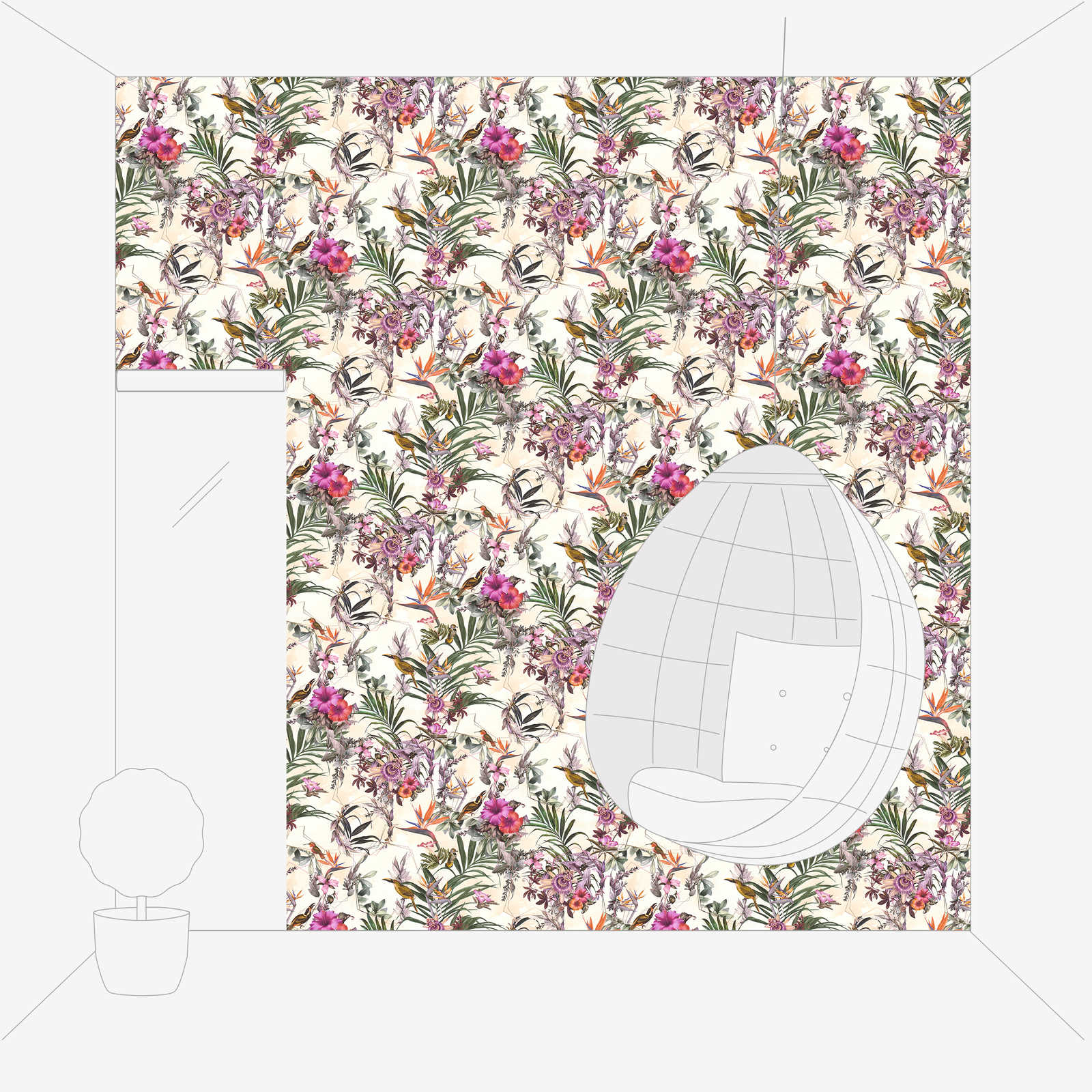 Design wallpaper flowers & birds in Art style - beige, green, pink