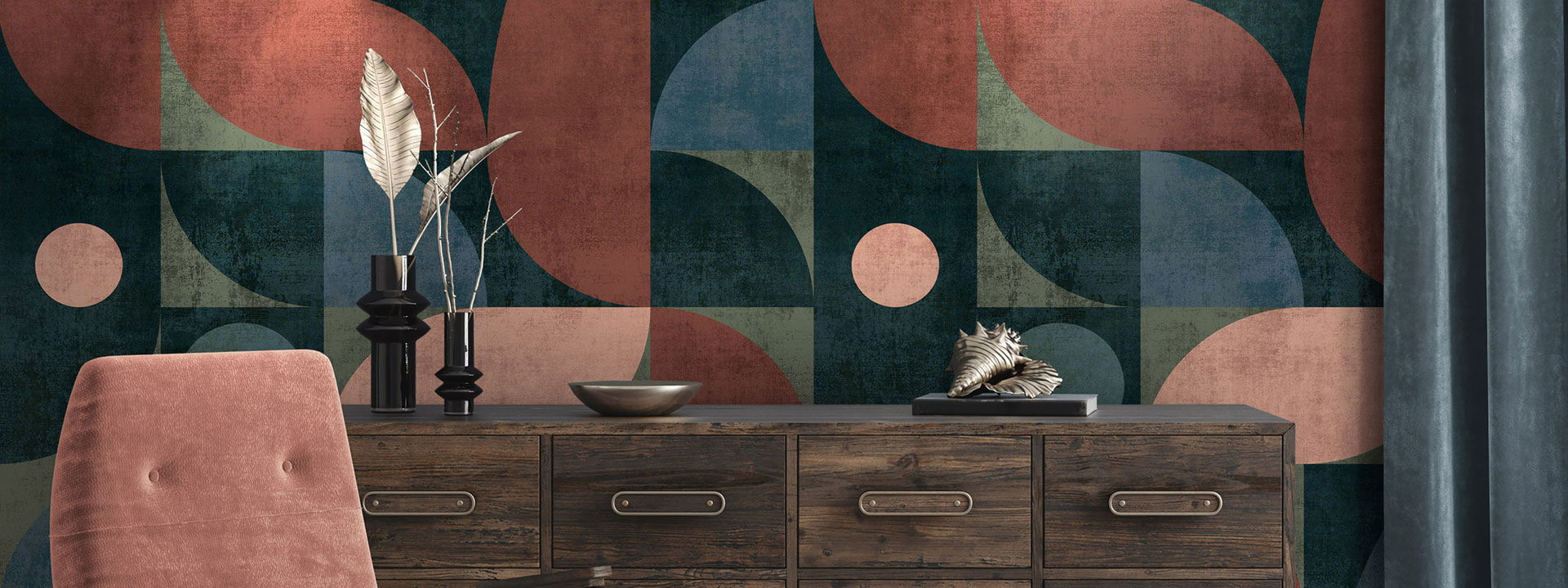 Papier peint intissé avec motif circulaire rétro - orange, beige, rose
