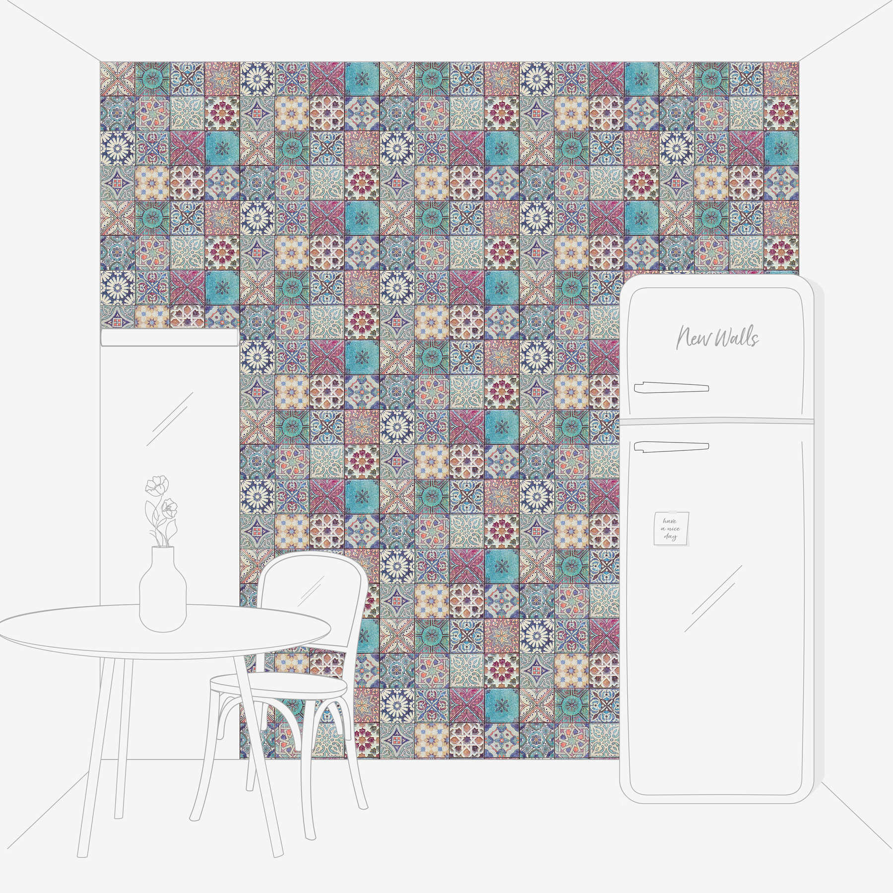 Papier peint carrelage aspect mosaïque - bleu, violet, crème
