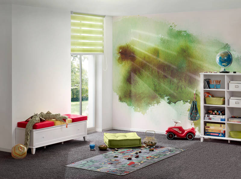 Papier peint avec des rinceaux de feuilles dans un look aquarelle - blanc, vert