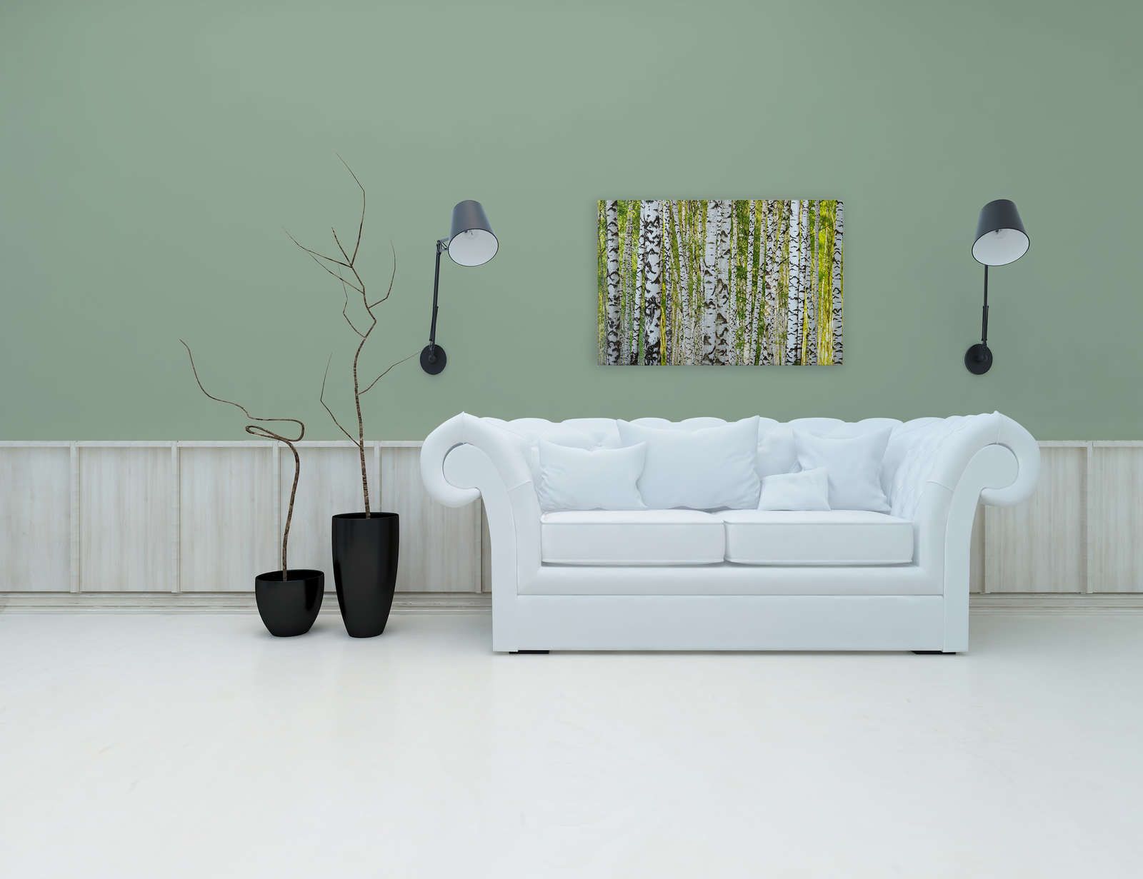 Papier peint panoramique forêt de bouleaux aspect lin - vert, blanc, noir