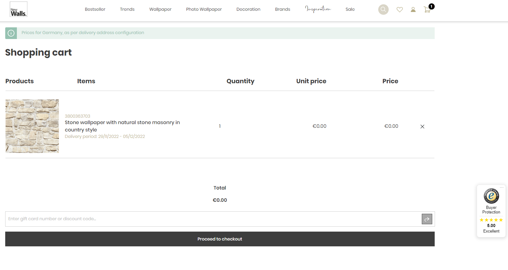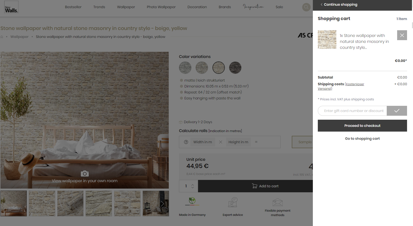 Votre inscription est terminée, alors c'est parti ! Parcourez notre gamme et choisissez jusqu'à 10 papiers peints ou bordures. À côté de chaque article pouvant être commandé sous forme d'échantillon figure dorénavant l'option « Ajouter un échantillon gratuit au panier ». Cochez cette option puis cliquez, c'est dans votre panier. L'échantillon apparaît directement dans l'aperçu du panier.