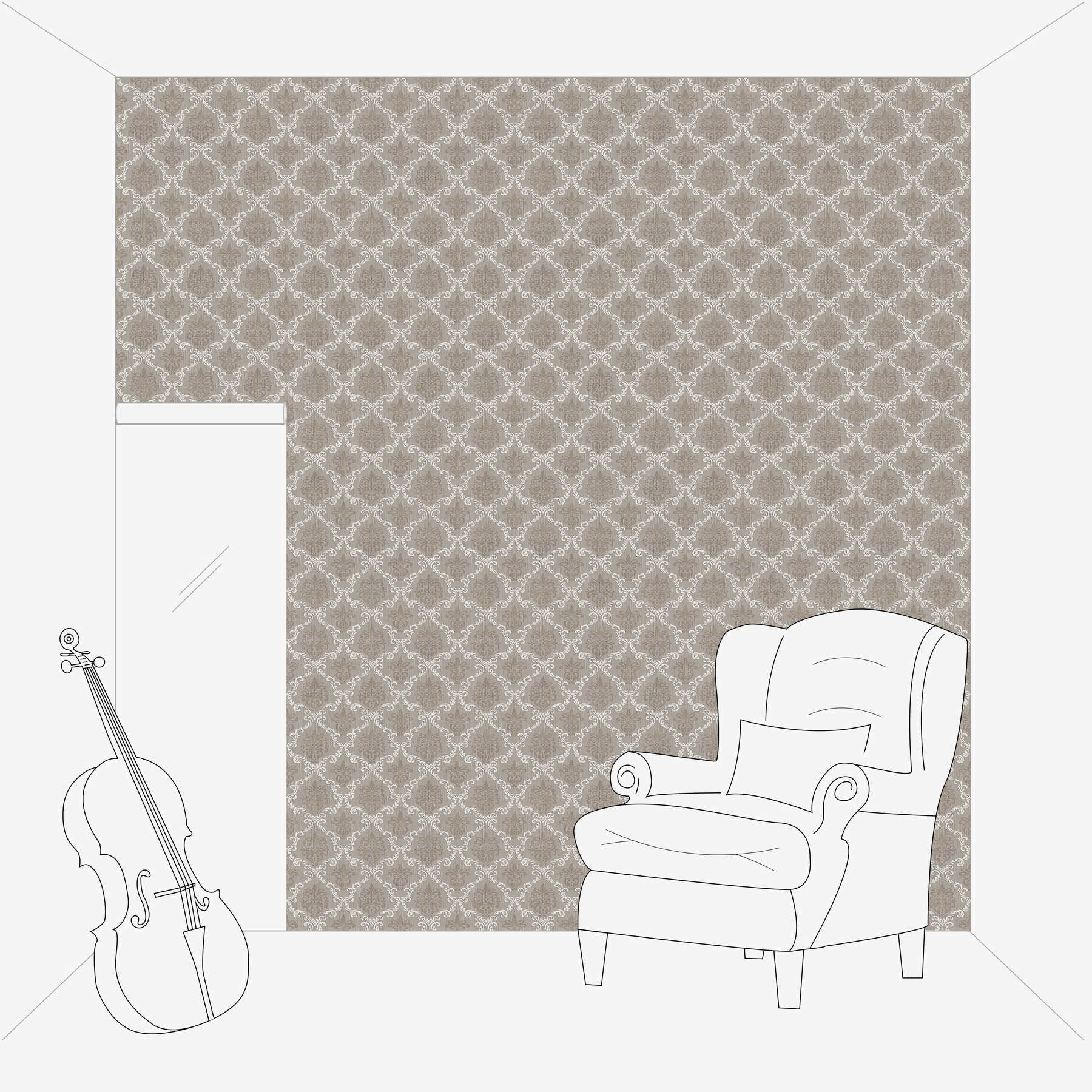 The wallpaper features an elegant, classic damask pattern. The background is a soft shade of grey, which provides a calming and neutral base. A filigree, ornamental pattern in a warm brown tone, reminiscent of floral or baroque elements, unfolds on this background. These ornaments are arranged symmetrically and convey a sense of order and elegance.Above the brown pattern is another, finer design in a brilliant white that frames and enhances the main patterns. These additional embellishments look like delicate tendrils and give the wallpaper an extra dimension of depth and sophistication.The colour scheme of grey, brown and white harmonises perfectly and creates an atmosphere of cosiness and harmony. The overall picture radiates a calm yet sophisticated mood that works well in both traditional and modern interiors.