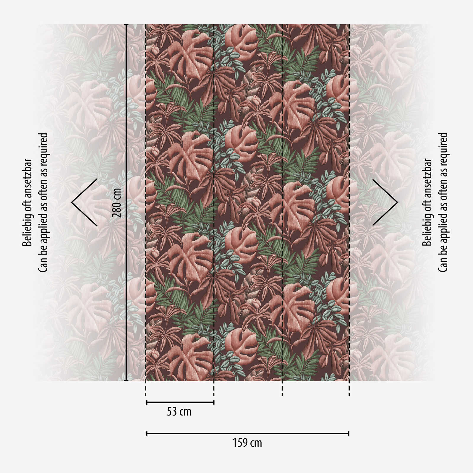 De Onderlaag behang heeft een weelderig, tropisch bladmotief met grote monsterabladeren in een rijke, schemerroze kleur. Verspreid tussen deze bladeren liggen palmachtige, donkerpaarse bladeren die een harmonieuze aanvulling vormen. De kleinere, levendige groene bladeren zorgen voor accenten die het totaalbeeld breken en frisheid toevoegen. De achtergrond is diep, bijna zwart paars, wat de bladeren dramatisch benadrukt en ze een zekere diepte geeft. De stijl is klassiek met een vleugje exotische elegantie en straalt een luxe maar rustgevende sfeer uit. Deze kleuren en monsters geven de kamer energie zonder overheersend te zijn, waardoor een warme en uitnodigende omgeving ontstaat.