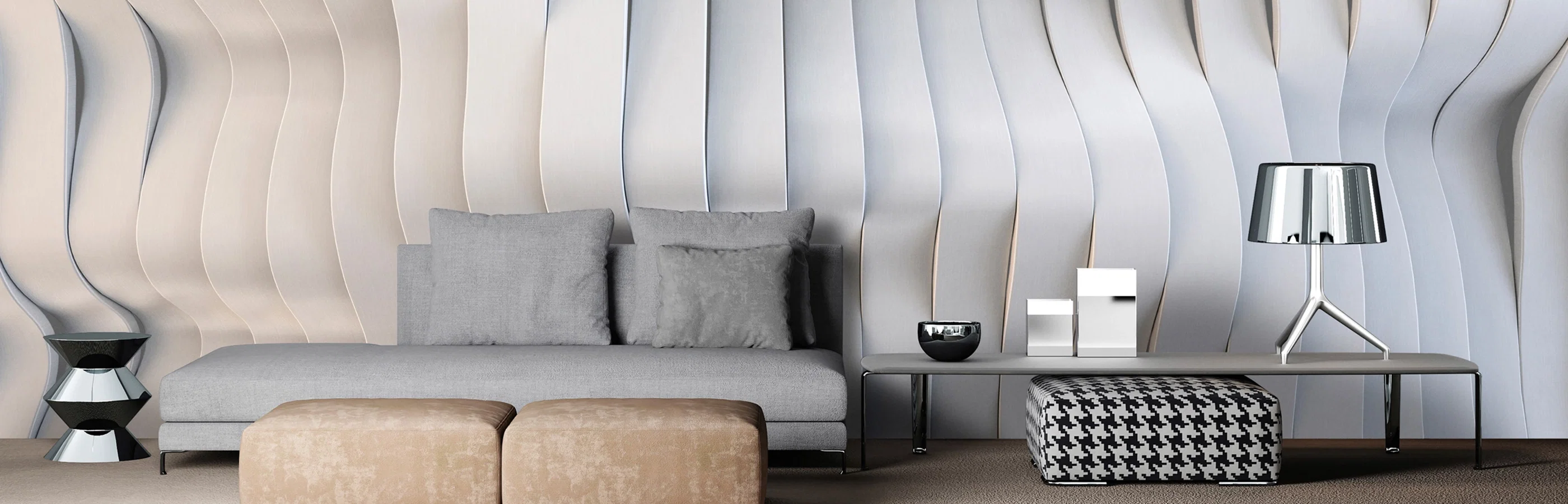 Grafische canvasdoeken en modern ontworpen lampen benadrukken het ruimtelijke effect van 3D-behang en vullen de look aan met stijlvolle lichtheid.