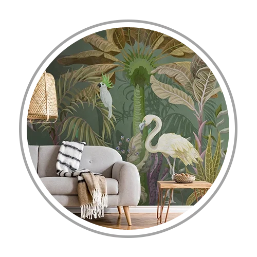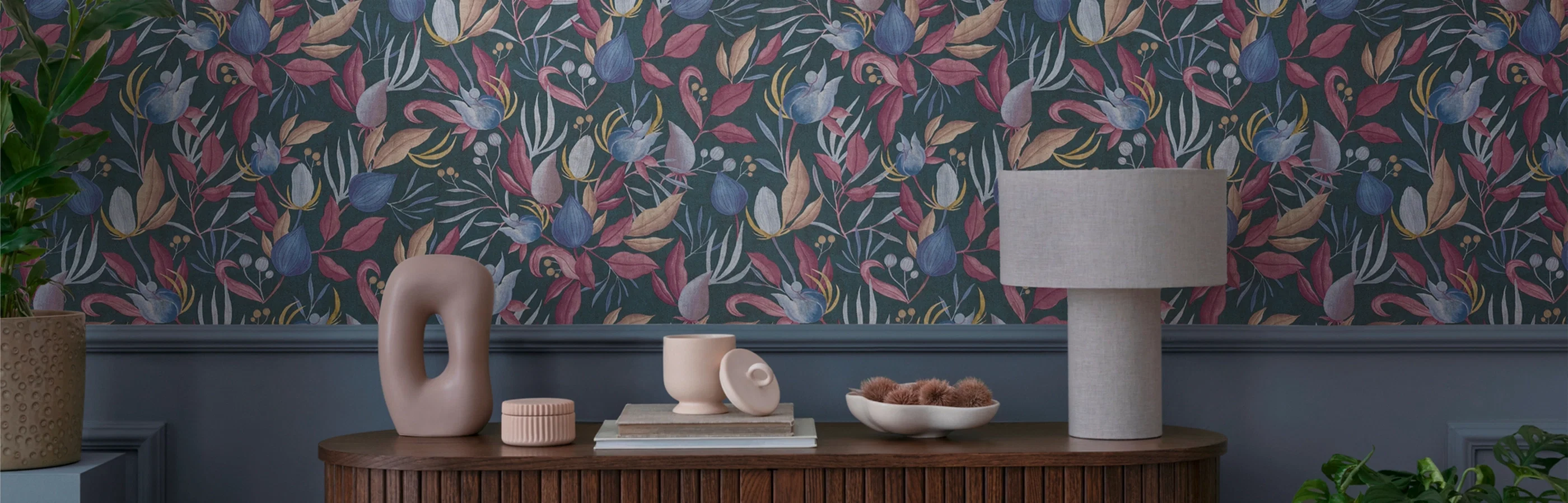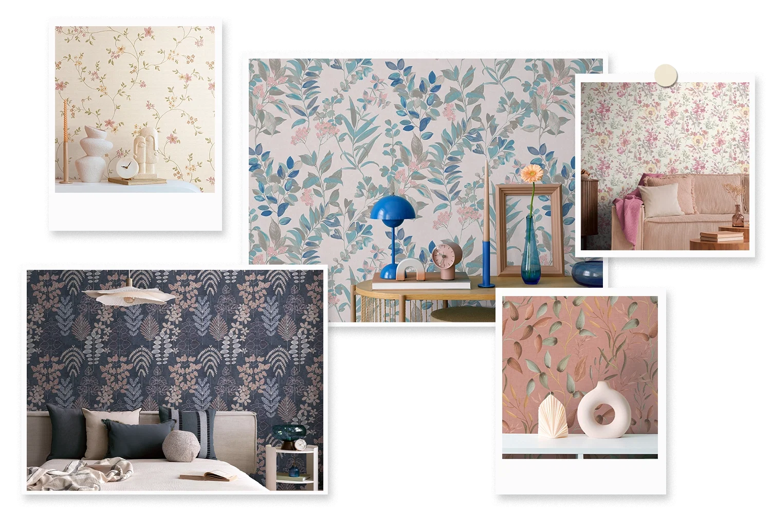 De juiste decoratie maakt de bloemenlook harmonieus af. Canvasdoeken met bloemmotieven of bijpassende lampen onderstrepen de natuurlijke uitstraling en sluiten stijlvol aan bij de kleuren en vormen van het behang.