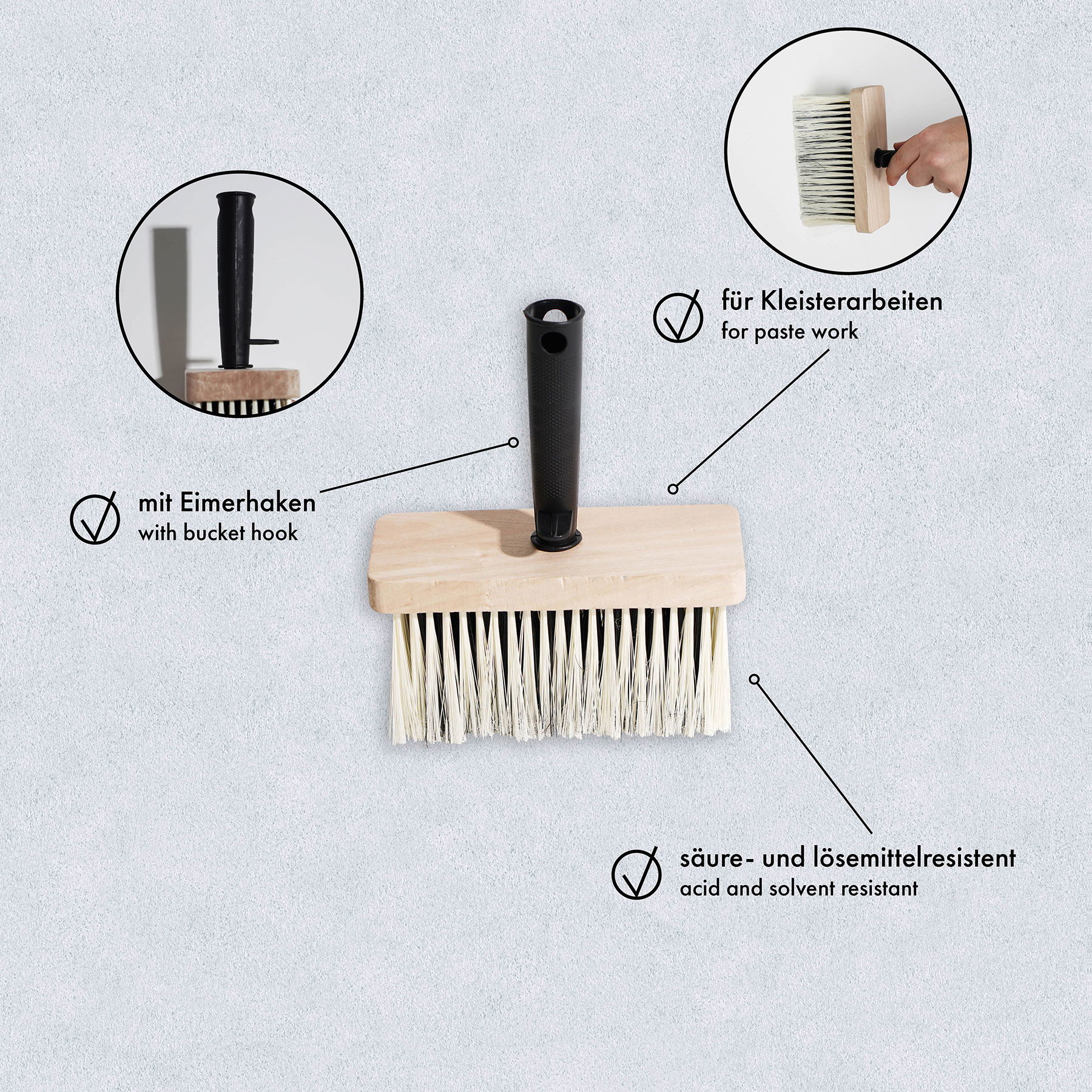 Behangersborstel voor plakwerk, voor het borstelen van wandoppervlakken en behang met een brede borstelkop. De wastafelborstel bestaat uit gestanste haren, een houten lichaam en het plastic handvat met emmerhaak. De zuur- en oplosmiddelbestendige borstelharen verdelen de pasta gelijkmatig en gelijkmatig over het oppervlak voor een mooi en snel behangresultaat.