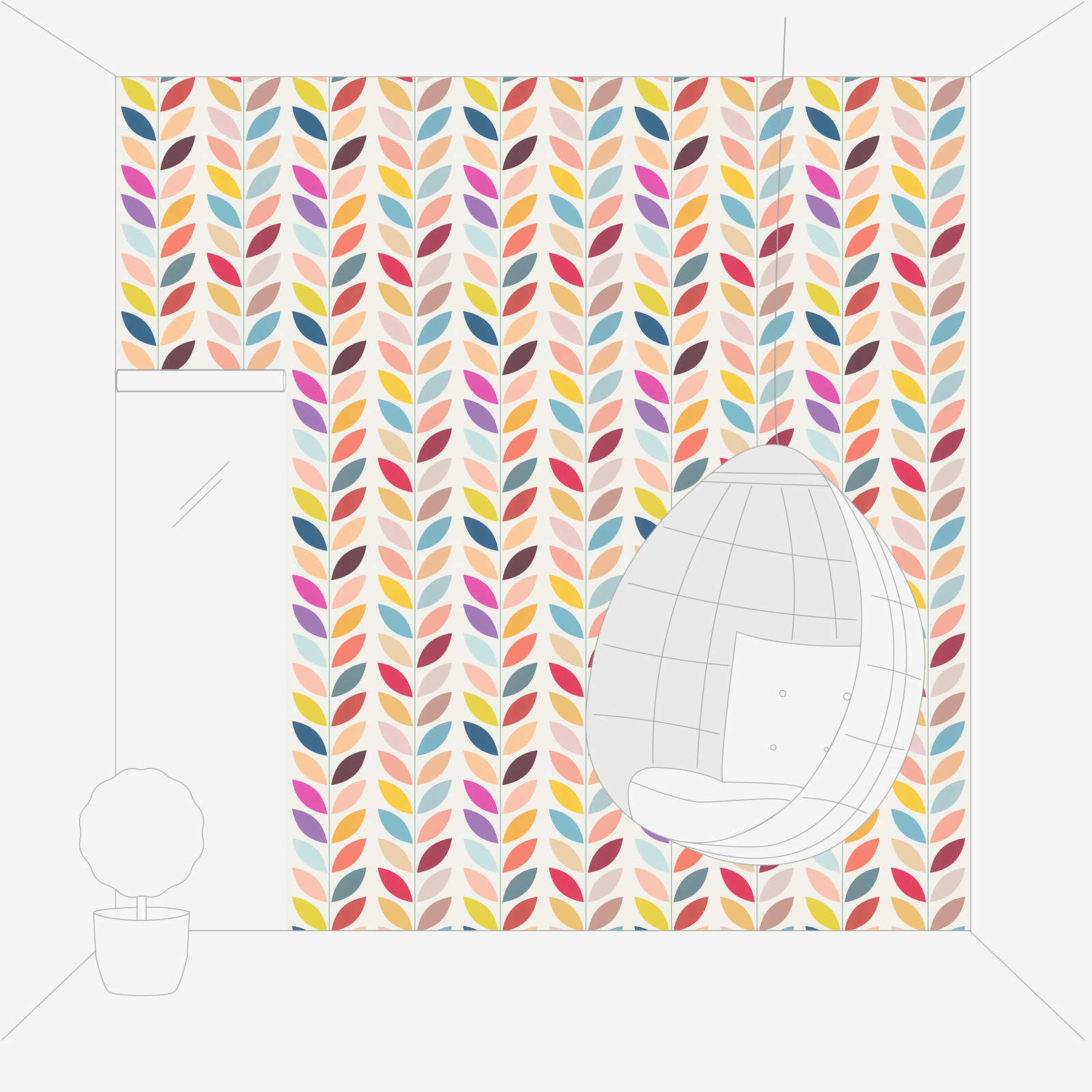 Het behangpatroon heeft een speels en toch Modern Design met geordende rijen gestileerde bladvormen. Deze bladeren zijn in een verscheidenheid van levendige maar zachte kleuren, waaronder oker, koraalroze, lichtblauw, mosterdgeel, lila en diep indigo. De achtergrond is eenvoudig, warm wit waardoor de kleuren van de bladeren goed uitkomen.