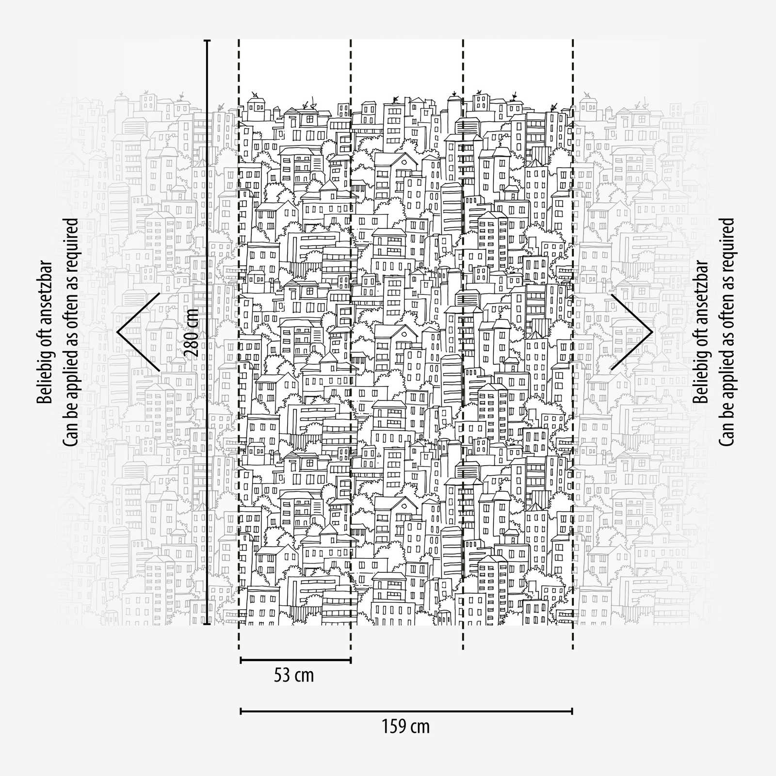 Vliesbehang voor kinderkamers met een skyline van huizen en een grootschalige patroonherhaling - zwart, wit
