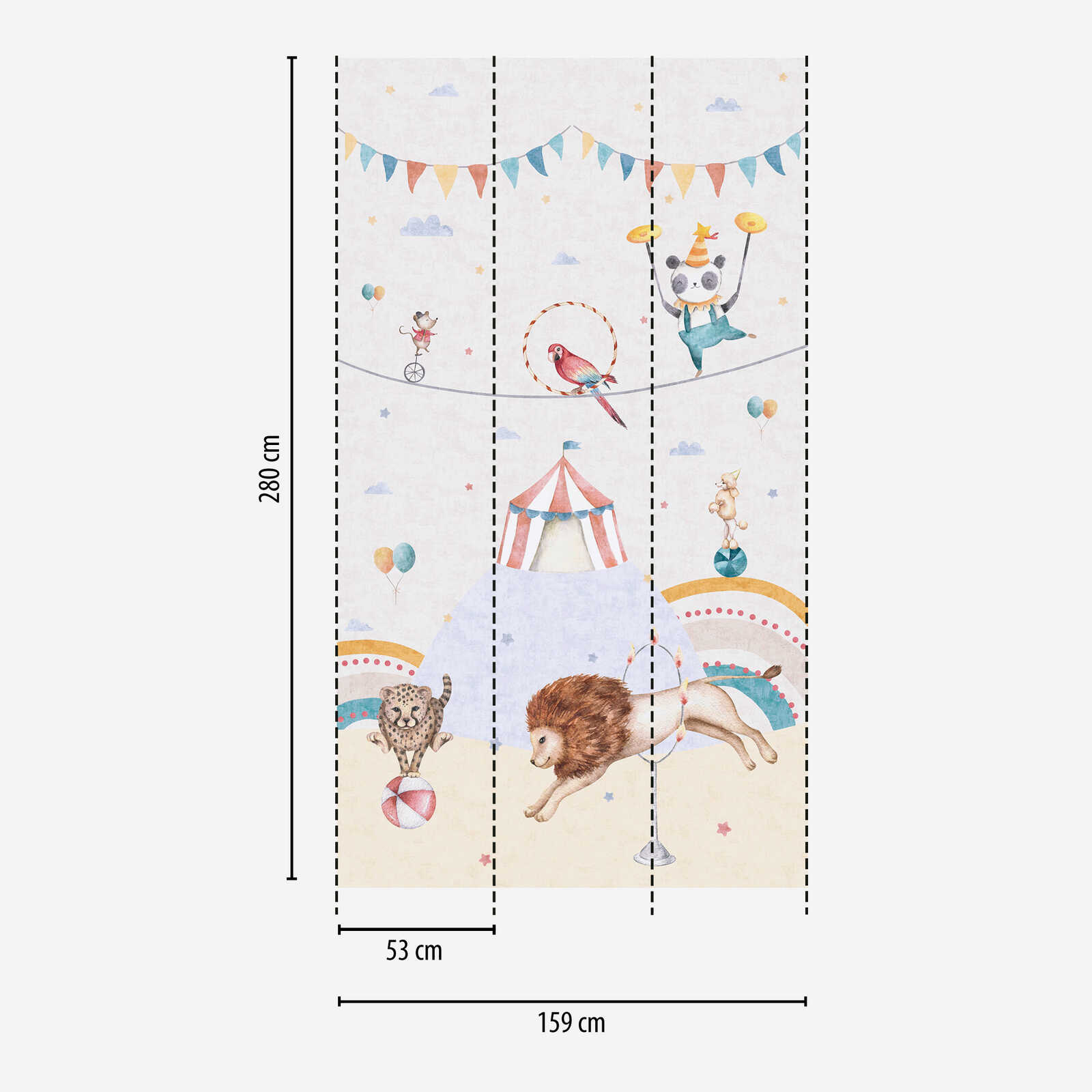 Zirkuszauber non-woven wallpaper panel 159cm wide x 280cm high - Cheerful animals and colourful accents for an imaginative children's room, smooth surface - Colourful