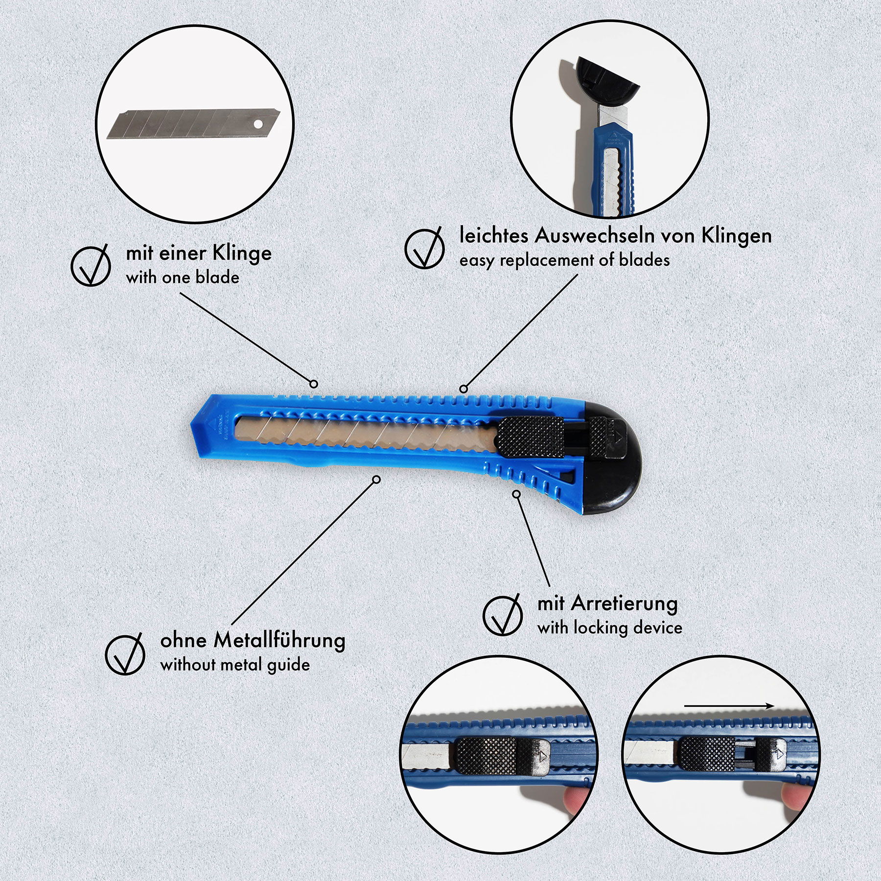 • Snap-off blade, plastic guide with locking option