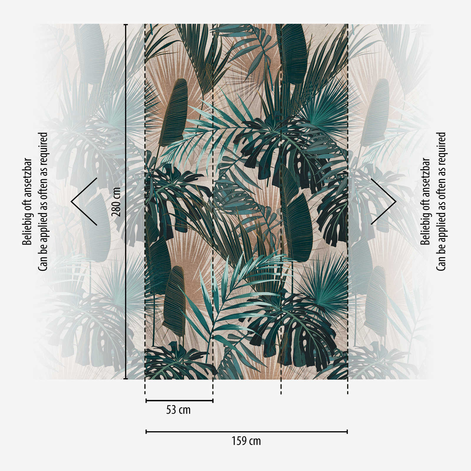 Wallpaper with jungle leaves motif - green, beige, petrol