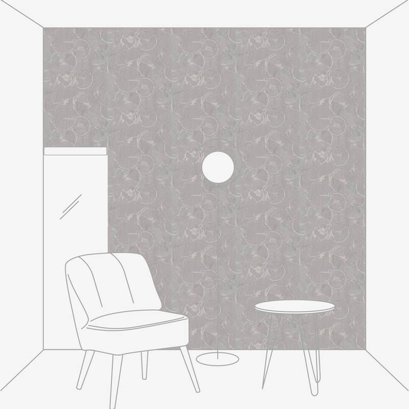 The wallpaper pattern shows an arrangement of concentric circles that are reminiscent of the annual rings of tree trunks. The different circles overlap slightly, creating a harmonious yet dynamic overall look. The lines of the circles are clear and regular, giving the pattern a graphic, modern effect. The colour scheme is restrained in various shades of grey, with a lighter base tone combined with fine, darker lines. This gives the wallpaper a subtle yet structured and lively effect. Overall, the interplay of form and colour creates a calm, natural atmosphere with a touch of Scandinavian minimalism.